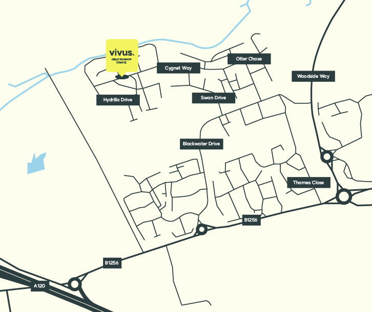 Begin on the M25 north and exit at Junction 27 for the M11 northbound towards Cambridge. Continue for around 12 miles, then take Junction 8A to join the A120 towards Stansted and Great Dunmow. Stay on the A120 for about 5 miles before turning left onto the B1256. After approximately 3 miles, you’ll arrive at Blackwater Drive. Follow this road to your new home.