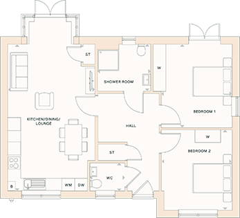The open-plan kitchen, dining and living area creates a bright, easy-flowing space at the heart of the home. Two comfortable bedrooms and a family bathroom keep everyday living straightforward.